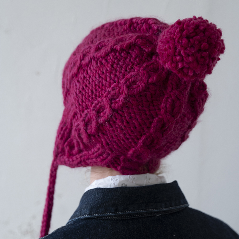 てっぺんと左右にぶら下がるフワフワのボ ンボンが特徴のニットキャップ。手触りを 存分に楽しみながら編んでくださいね。