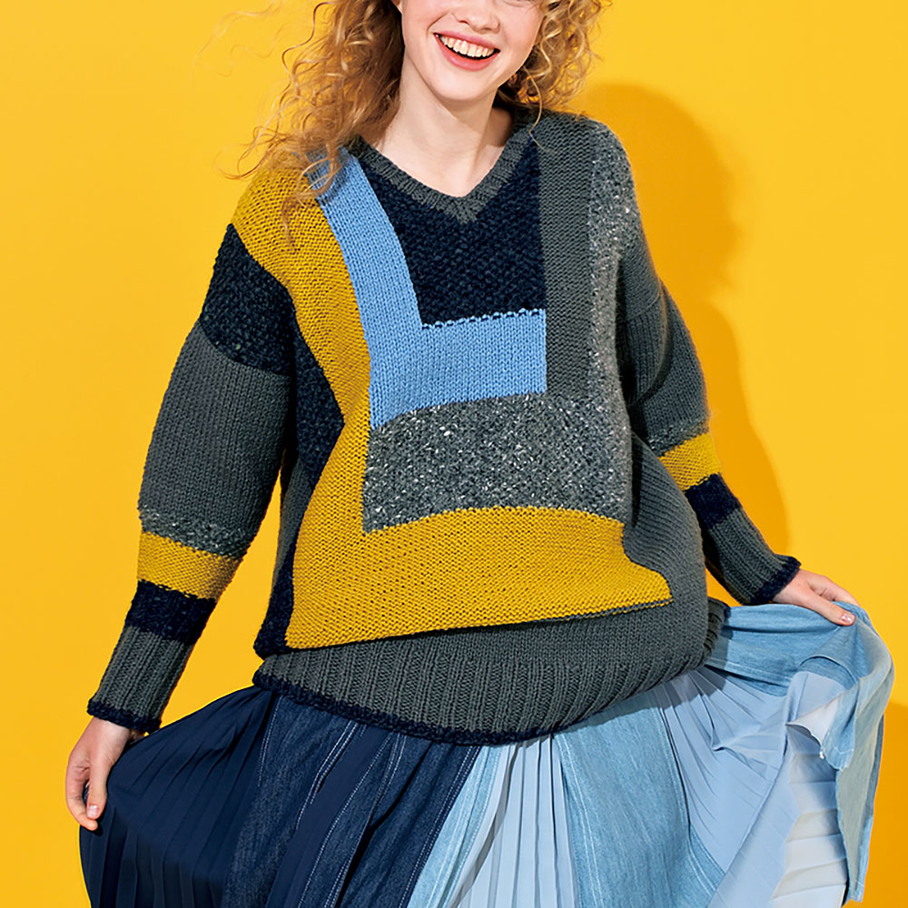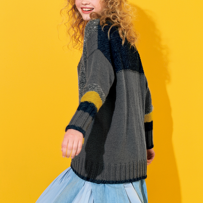 大きなカラーブロックで色を切り替えた大胆なデザイン。質感の違う糸のセレクトや、裏目の効果的な使い方にも注目してください。ビッグシルエットが可愛いニットです。