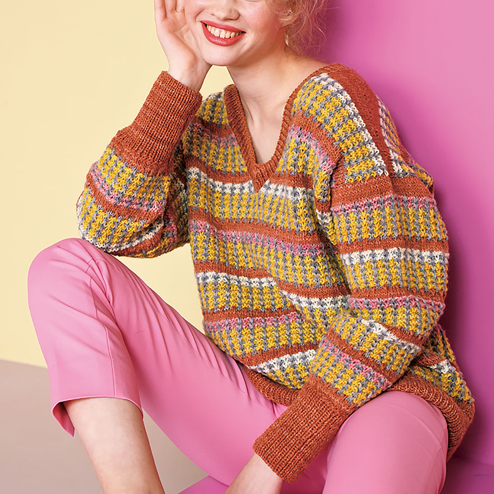 カラフルなマルチボーダーの中にすべり目を入れて編み地に変化を。肌触りが良く 軽い着心地なので、スウェット感覚でざっくり着られます。明るい色からシックな色 までのミックスカラーは、組み合わせ次第で様々な表情を見せてくれます。