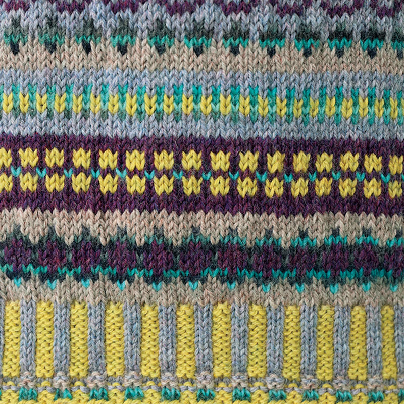 材料:パピー ブリティッシュエロイカ 薄紫(188)165g/4 玉、紫(183)130g/3 玉、からし色(206)95g/2 玉、薄茶(200)90g/2 玉。ミュルティコ 緑系段染め(574)95g/3 玉。