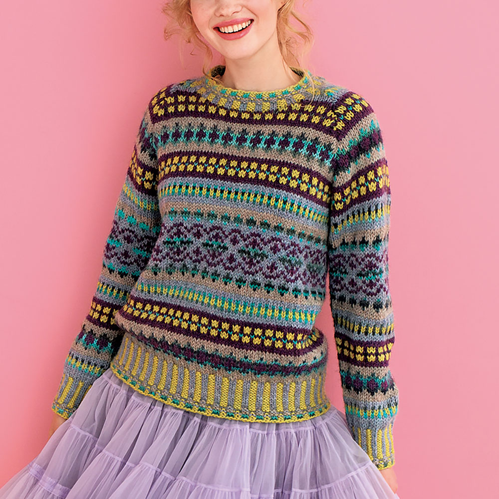 メランジ調の糸を4色と段染めの糸を組み合わせて、もっと多色を編み込みにし たような、複雑なニュアンスを出しています。ラグランスリーブで模様の出方も少し 新鮮に。