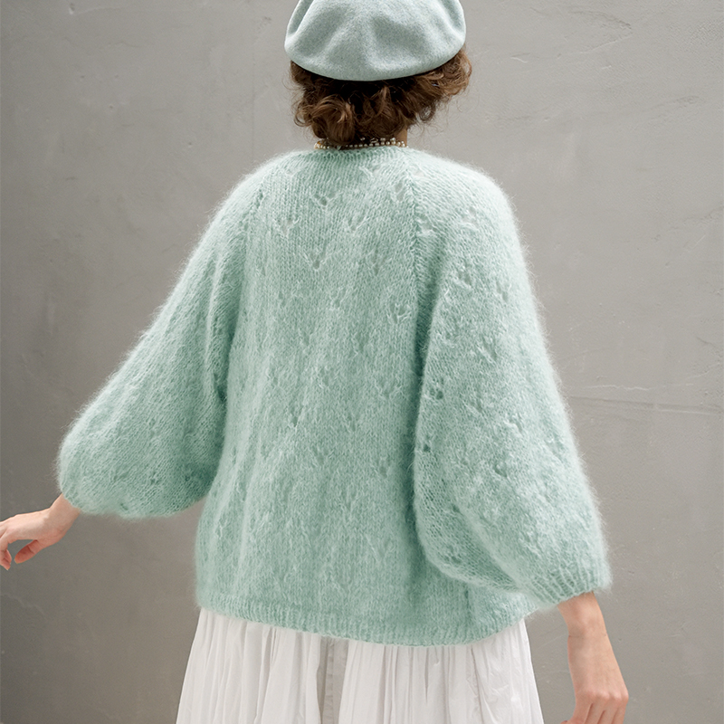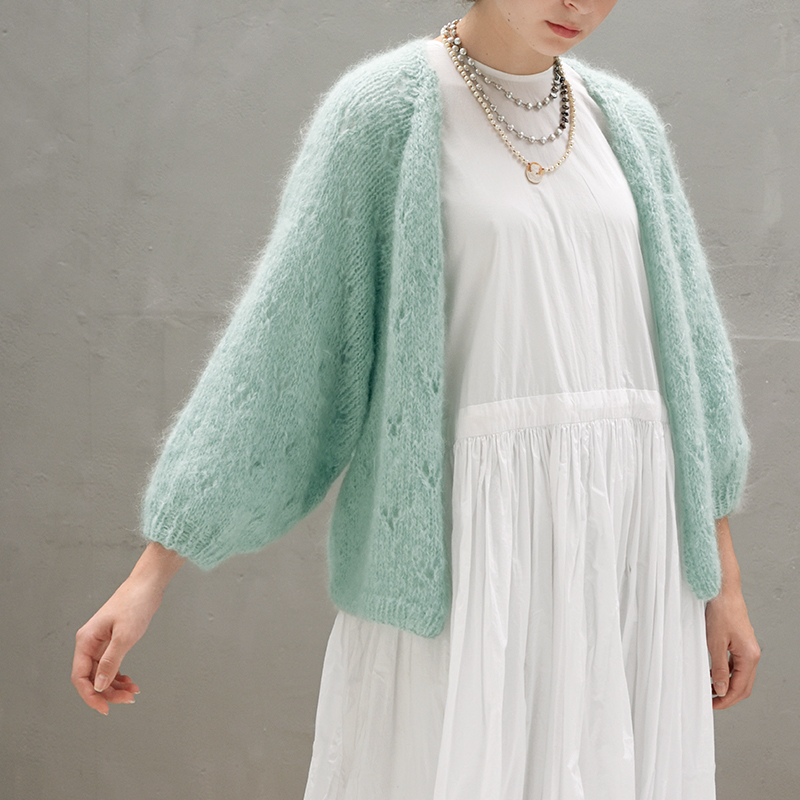 材料:DARUMA ウールモヘヤ ミント(3)270g/14 玉。