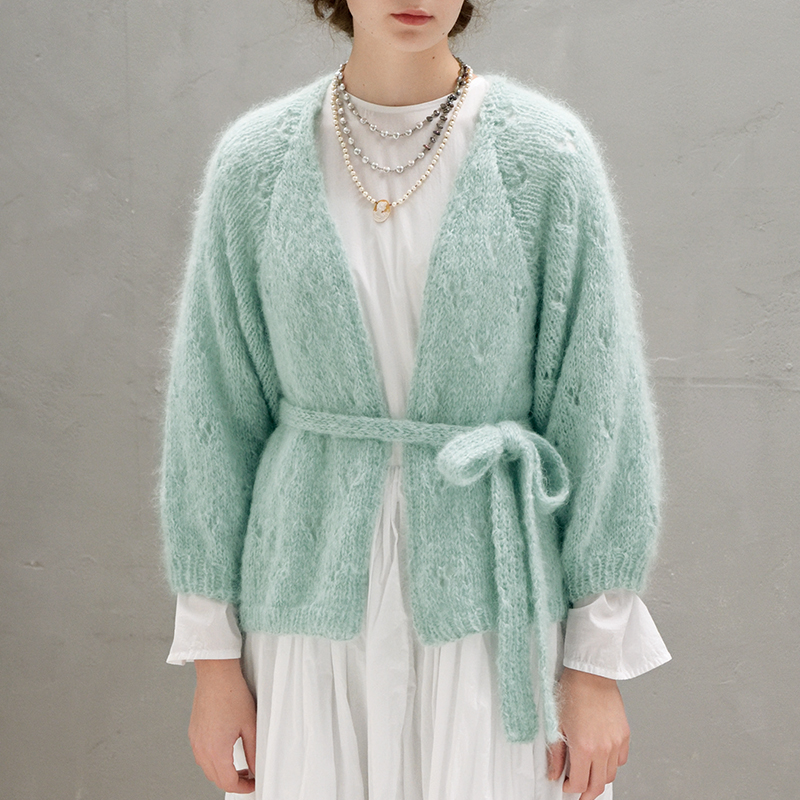 引き続きトレンドのビッグシルエットのウエアも、ふわふわ毛糸なら軽く仕上がります。バルーンのように大きく膨らんだ袖が可愛いラグランカーディガンは、共糸のベルトできゅっと結んだスタイルもクール。甘いだけではない、大人のふわもこスタイルです。