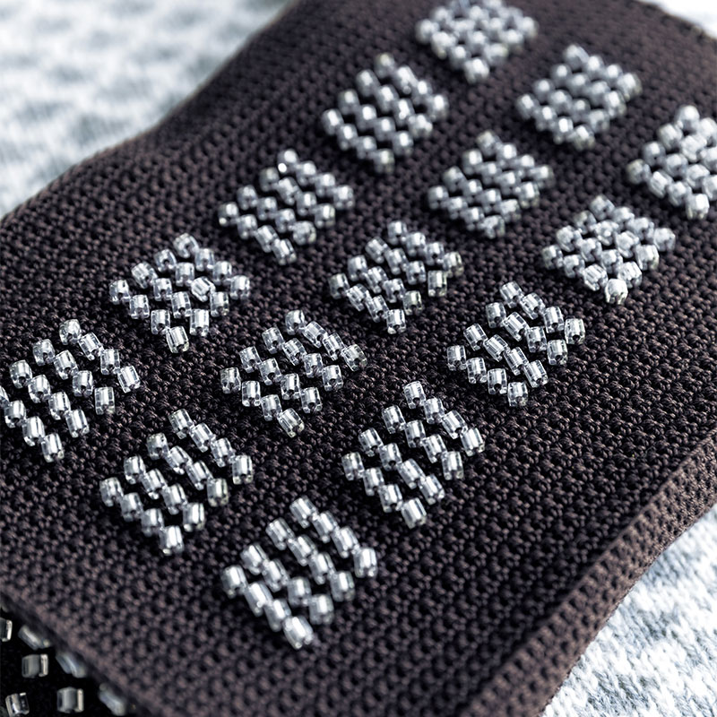 材料:DARUMA 鴨川#18 すみ黒(109)125g/3 玉。MIYUKI スクエアビーズ(SB242/4mm)クリスタル中染 369 個。Microアクリルビーズ(S215/50mm×40mm)黒(30)2 個。直径10mm の縫いつけマグネットホック1組。