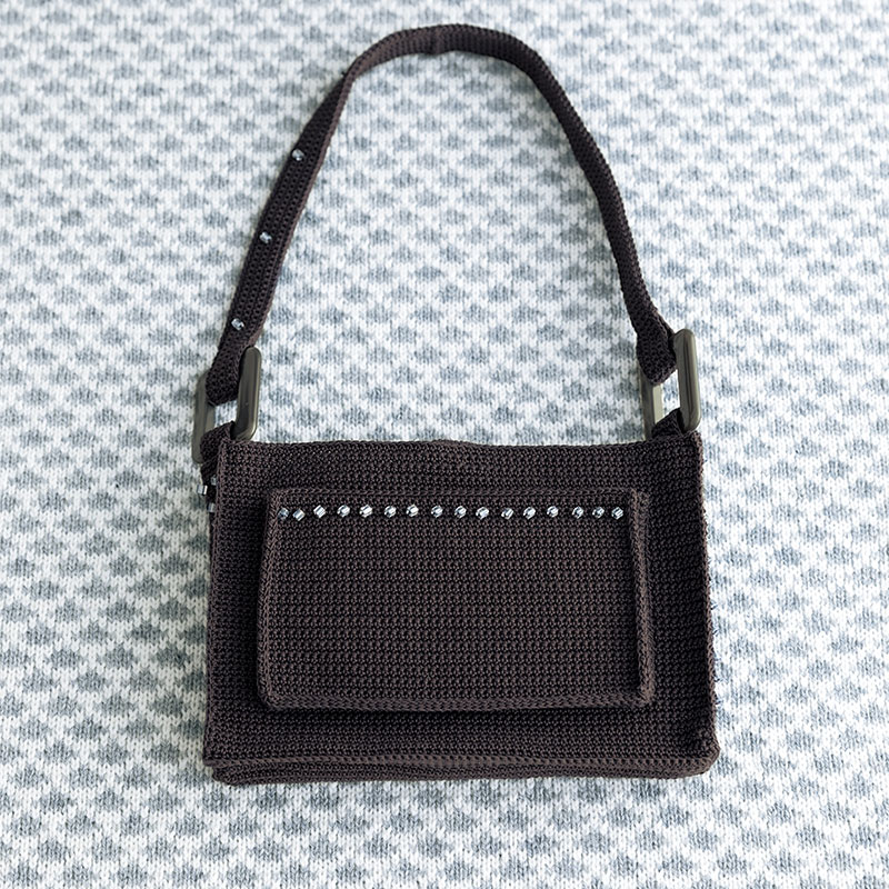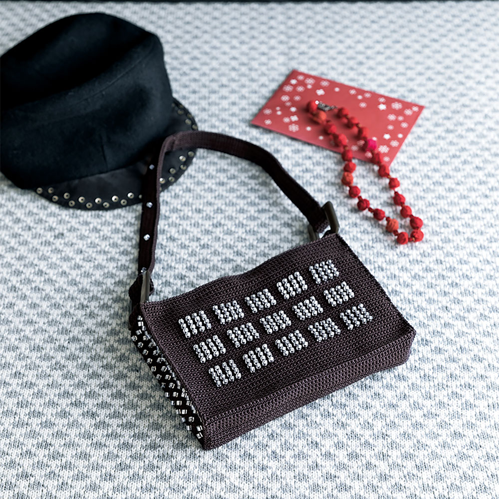 シックなブラック でかっちりと編んだハンドバッグは、スタッズのように並んだ大きめビーズが カッコいい仕上がりに。フォーマルにもマニッシュにも似合う、逸品です。