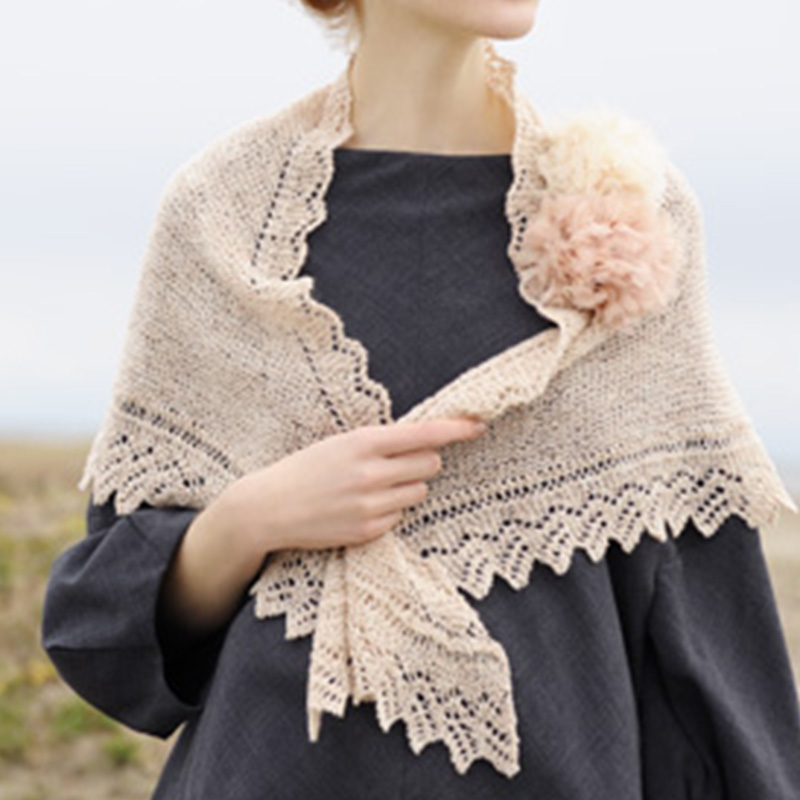 伝統的な模様を使用した三角ショールは、淡いピーチピンクで編むことでファッショナブルに生まれかわり、海を渡ってきました。本体はガーター編みでシンプルに、エジングさえちょっと頑張れば完成。