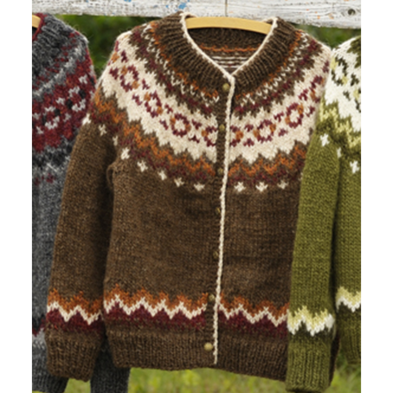 材料:イステックス アラフォスロピ 茶色(0053)430g/5玉、ベージュ(9972)115g/2玉、えんじ(9962)・オレンジ系ミックス(9971)各55g/各1玉。直径18mmのボタン7個。