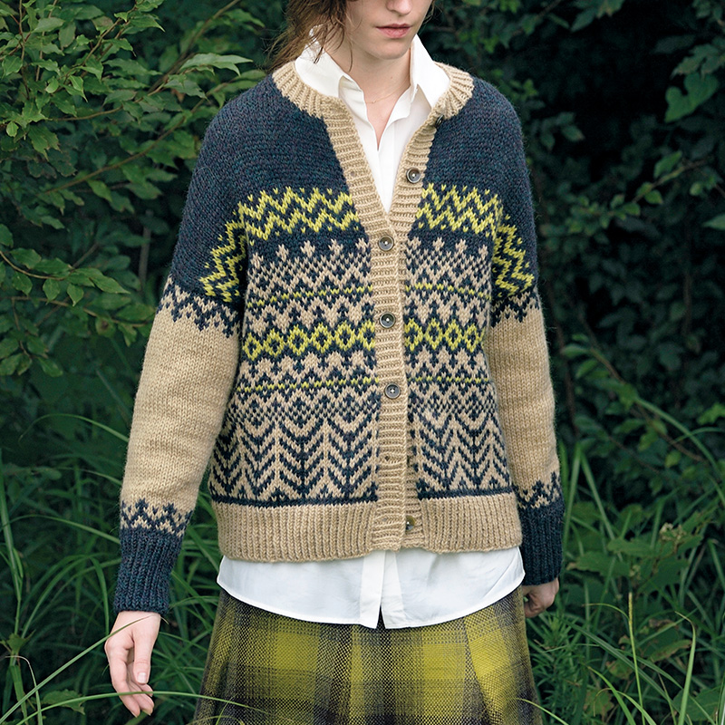 ベーシックな北欧パターンに、北欧でおなじみのニシンの骨のようなヘリンボーン柄を印象的にプラスして。ベージュやチャコールグレーにレモンイエローの配色が新鮮。ドロップショルダーにルーズめのフォルムが、伝統の中に“今”を感じさせます。