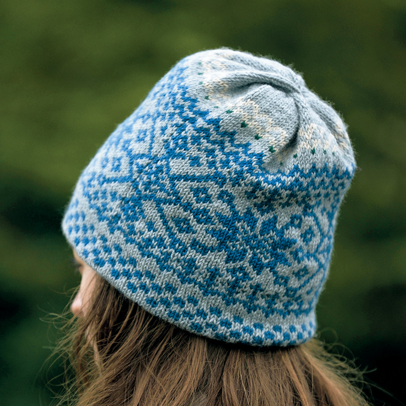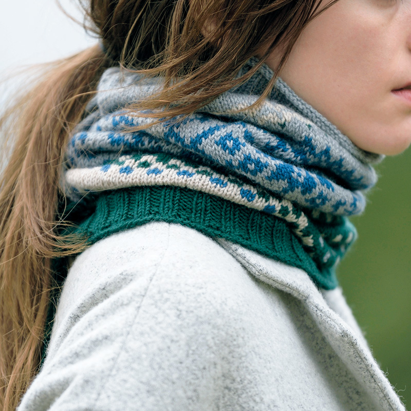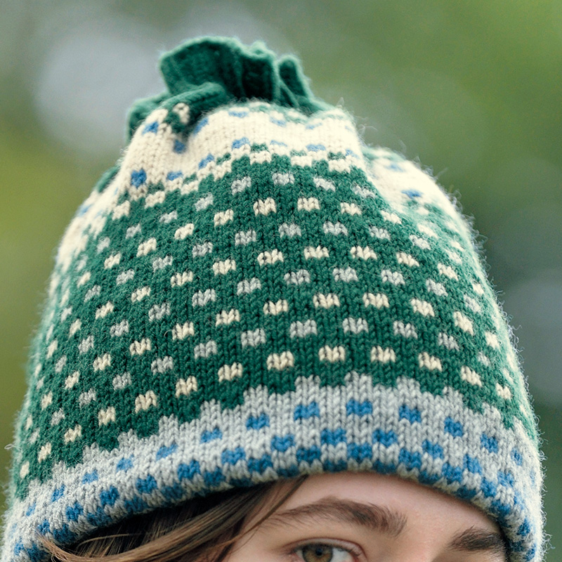 エイトスターをアレンジした編み込み模様とシンプルな柄を組み合わせた、ネックウォーマーにも帽子にもなる4wayニット。細い糸で筒状に柄を変えて編み、両側にひもを通しておくことで、そのままくしゅくしゅとネックウォーマーに、半分を内側に