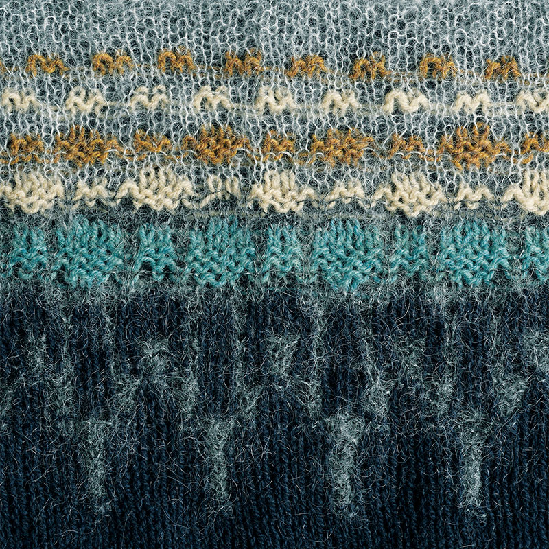 ボーヒュースのエッセンスを活かして縦のパネル状に模様を配し、横編みにすることで新鮮な表情に。モヘアヤーンが柔らかなニュアンスを添えてくれます。