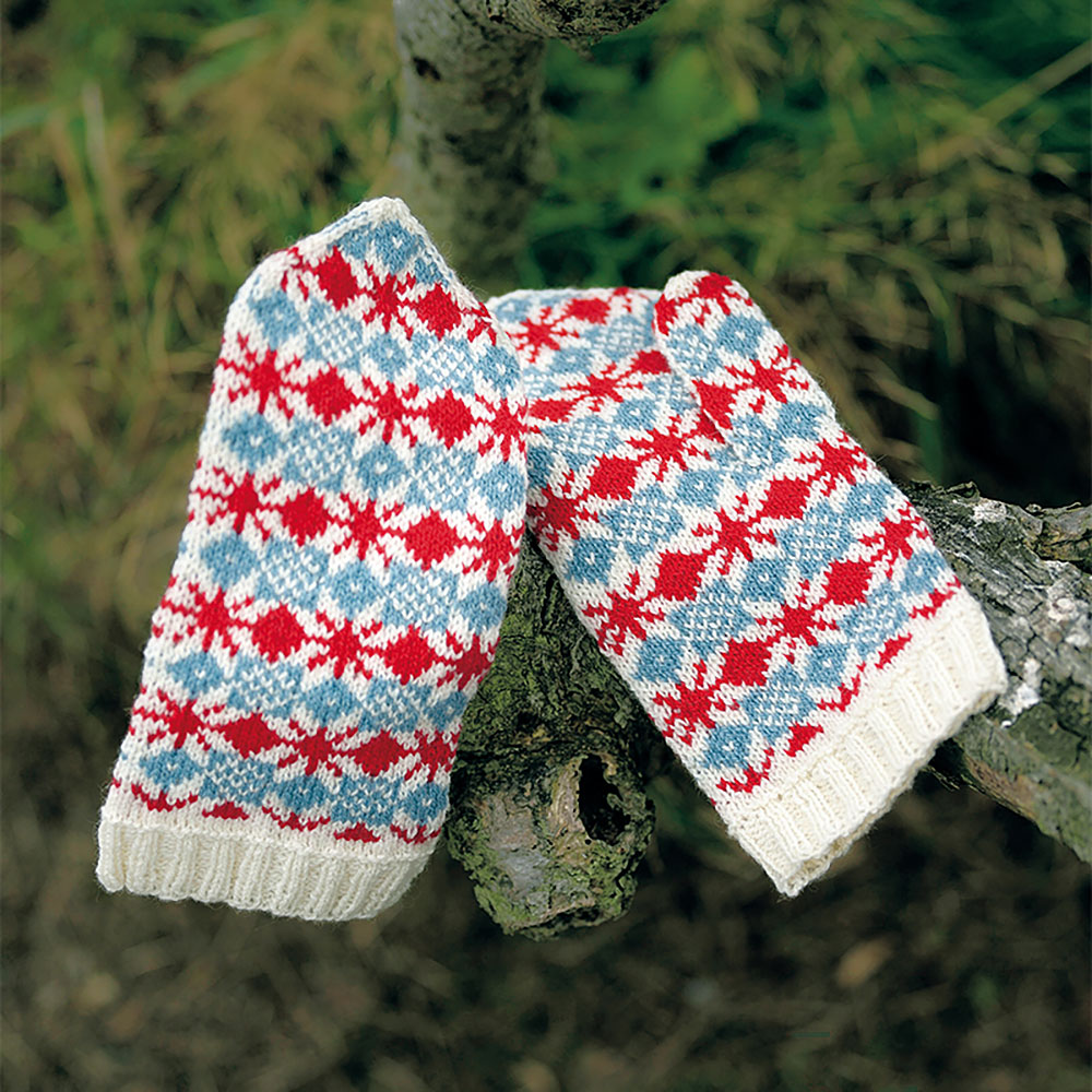エストニアの伝統柄は、よく見かける赤とインディゴブルーの組み合わせも素敵ですが、今回は少し明るめの水色と合わせて可愛らしくしてみました。冬のコーディネートのアクセントになるミトンです。