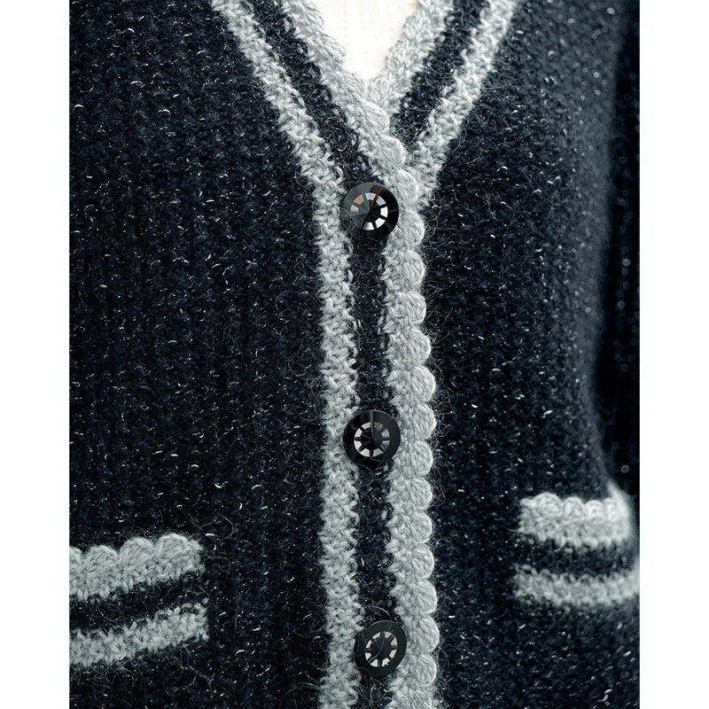 材料:[ジャケット]ダイヤモンド毛糸 ダイヤドミナ< ステラ> 黒(7708)340g/10 玉、薄グレー(7701)50g/2 玉。直径23mmのボタン3 個。[スカート]ダイヤモンド毛糸 ダイヤドミナ< ステラ> 黒(7708)310g/9 玉、薄グレー(7701)25g/1玉。幅25mm のゴムベルト66cm。