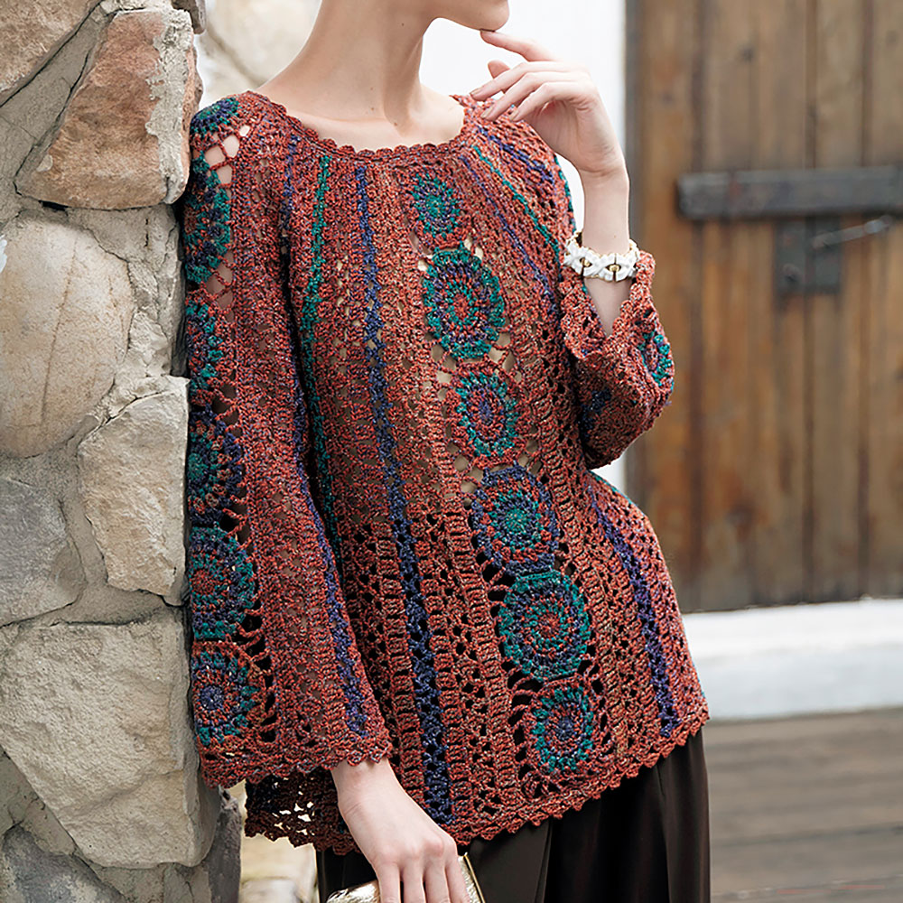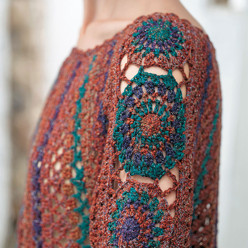 モチーフのパターンを変えてニュアンスをプラス。横編みの地模様は1段の中で細編みから長編みへと変化させ、無理なくきれいなシルエットを出しています。