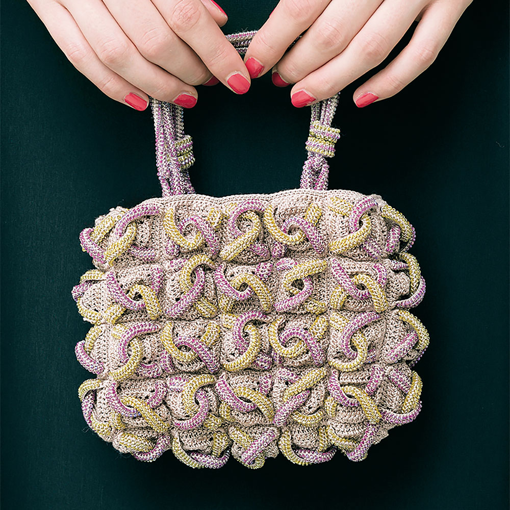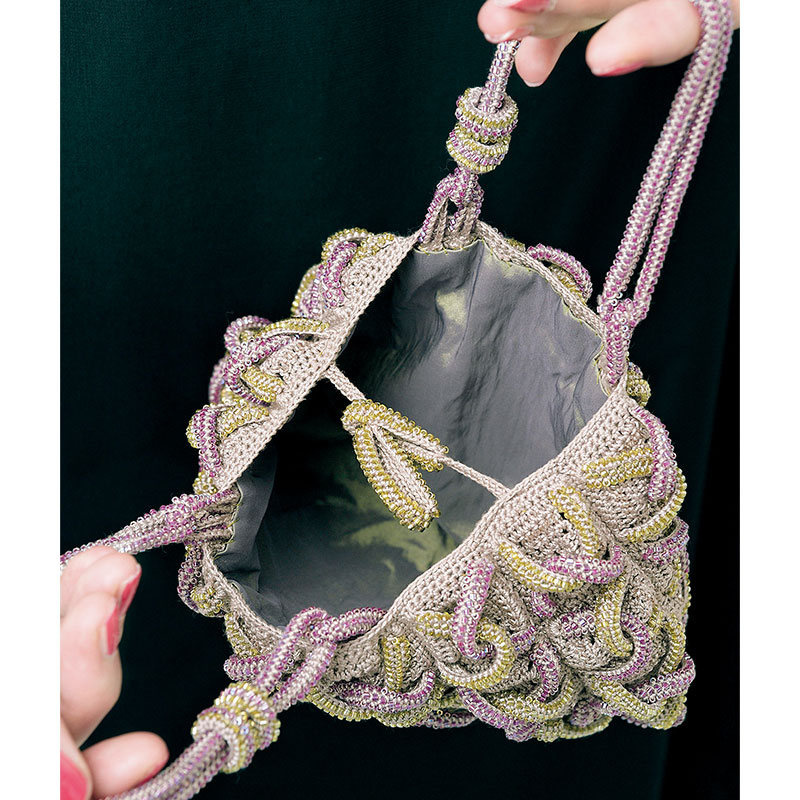 シンプルな細編みにビーズを編み込んだひもをクロスさせて、ユニークで立体的なモチーフに仕上げました。中のストッパーをはずすと、バッグのシルエットが変わります。入れる荷物に合わせて、つなぐモチーフの数を変えても。