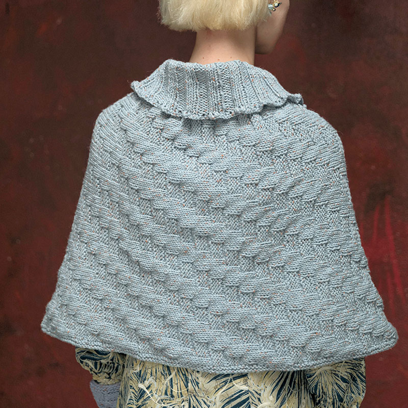 ストールのようにまっすぐ編んではぎ合わせ、衿を編み出したポンチョ。表目のブロックがポコポコと並んで斜めのラインを描き、ユニークな編み地になっています。お揃いのウォーマーは模様の角度が違うので、見え方が少し変わります。