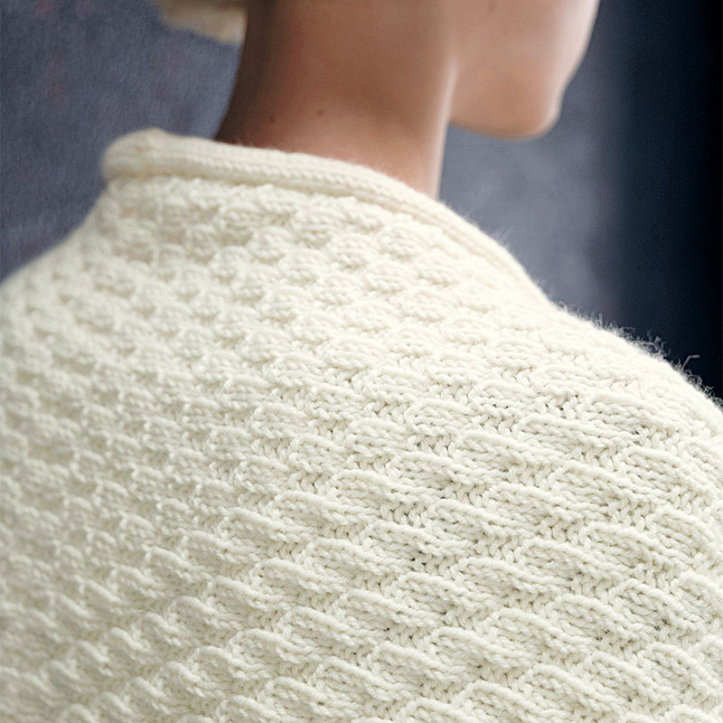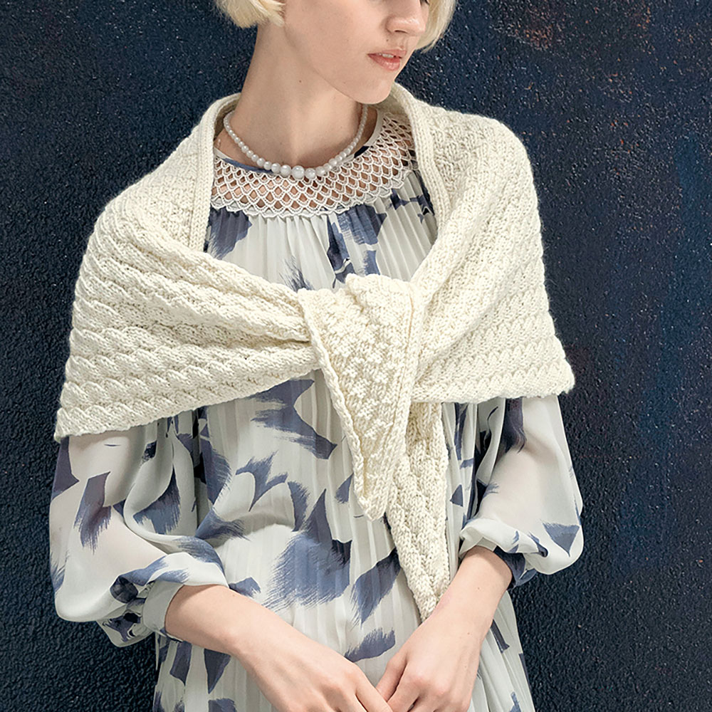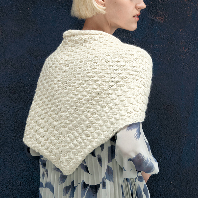 中心から左右それぞれに向かって直角三角形を編みます。三角ショールの頂点へと表目のブロックの大きさを変化させ、ふっくらしたフォークランドウールで美しい陰影を表現した柔らかなショールです。