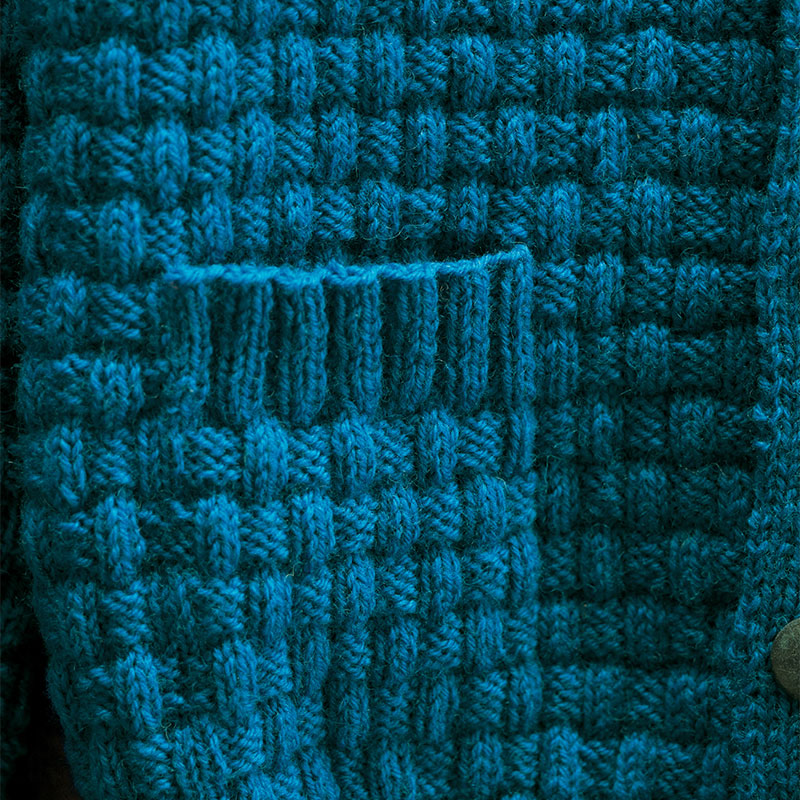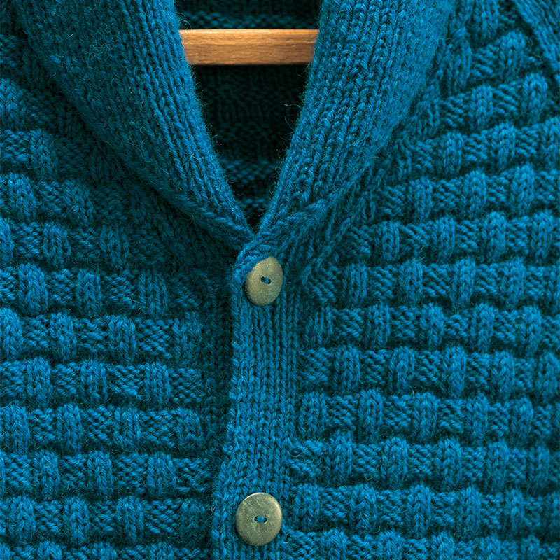 海色ブルーのメンズジャケットは、表目と裏目のブロックが交互に組み合わさって、バスケット編みのよう。同じ目数のくり返しかと思いきや、記号図を見てびっくり。おふたりの関係、勉強になりました。