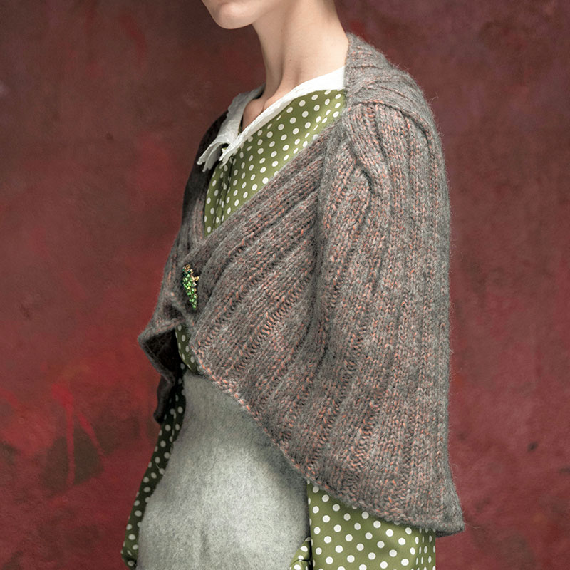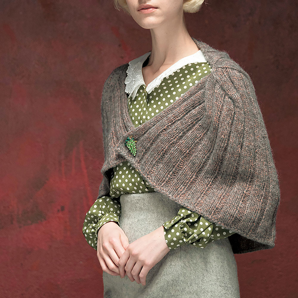 すっきりとした変わりゴム編みで仕上げたコクーンシルエットのケープは、衿側から編み始め、決まった段数を編んだ段から拾い目をして立体的な造形に。シンプルな編み目をテクニカルなデザインで魅せます。肩から落ちにくく、実用的なのも嬉しいポイント。