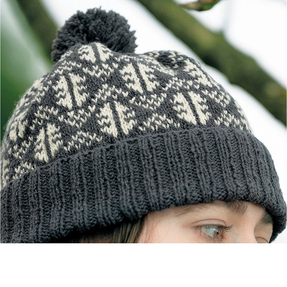 エストニアのミトンでよく見かける伝統柄を、帽子にアレンジしてみました。普段のコーディネートに取り入れやすいように、配色はシックにチャコールグレーと生成りを合わせて。