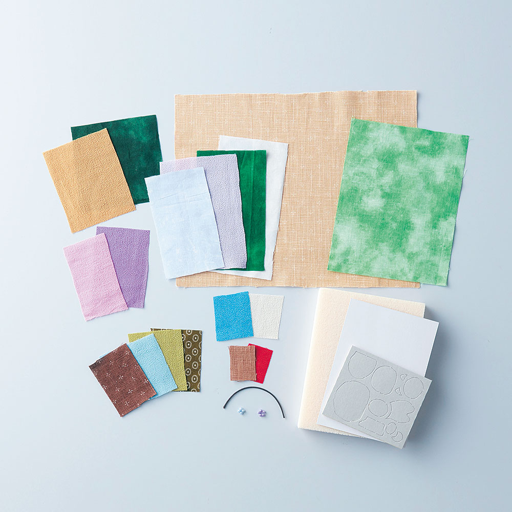 材料セット(ちりめん生地、柄生地、スタイロフォーム、型抜き済みウレタンシート、厚紙など)、作り方説明書