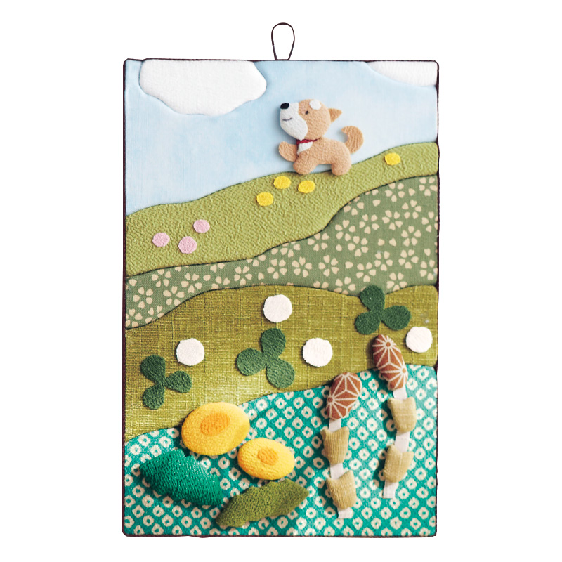 土台の切り込みに布を押し込み「きめこみ」とウレタンシートを布でくるむ「くるみ絵」を組み合わせて、立体感のある作品にしあげます。