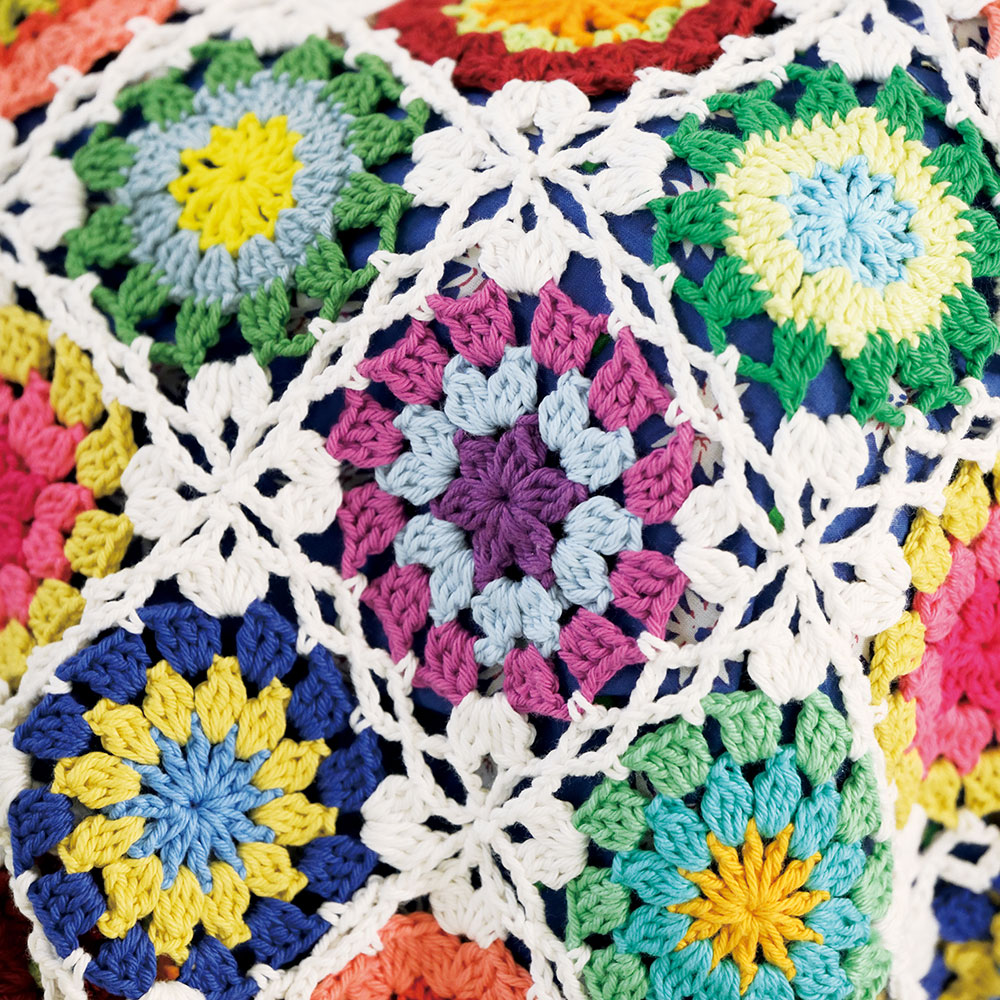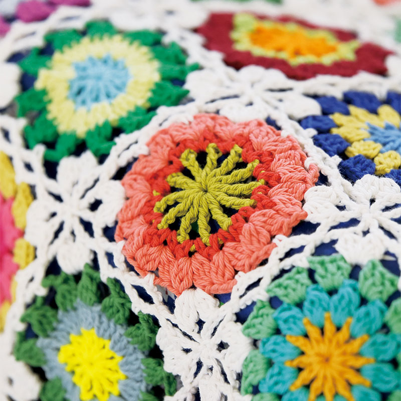あふれる色が、お部屋を明るい花畑に変えてくれます。カラフルなモチーフの中心を編みためて、白い糸で一気に編みながらつなげる連続モチーフです。つないだ角には新しい花が咲きます。小巻のコットン糸は、たくさんの色を少しずつ使いたいモチーフつなぎにぴったり。