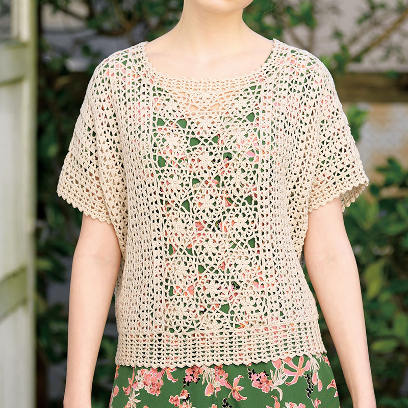 身頃中央に配したのは連続モチーフ。一筆書きのように、糸を切らずにラクラク編むことができます。モチーフから横に編み出したシンプルな地模様と組み合わせて、着やすいフレンチスリーブのプルオーバーに仕上げました。