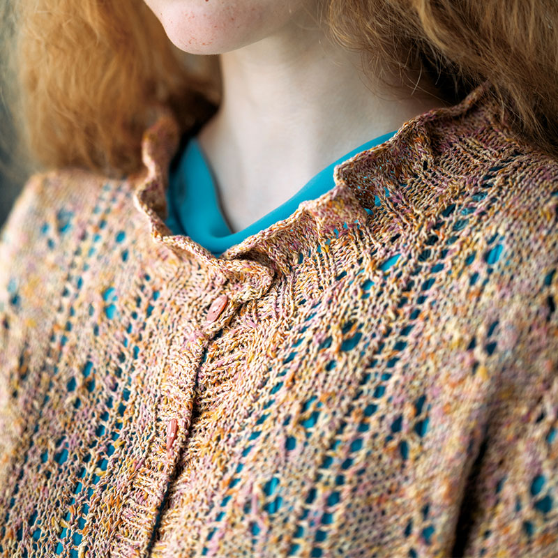 フリルの衿と少しロング丈のゴム編み、全体に少し長めの丈がポイントのジャケットです。色目の濃いワンピースにはおると、透かしの模様が美しく浮かび上がり、ロマンチックな気持ちにさせてくれます。