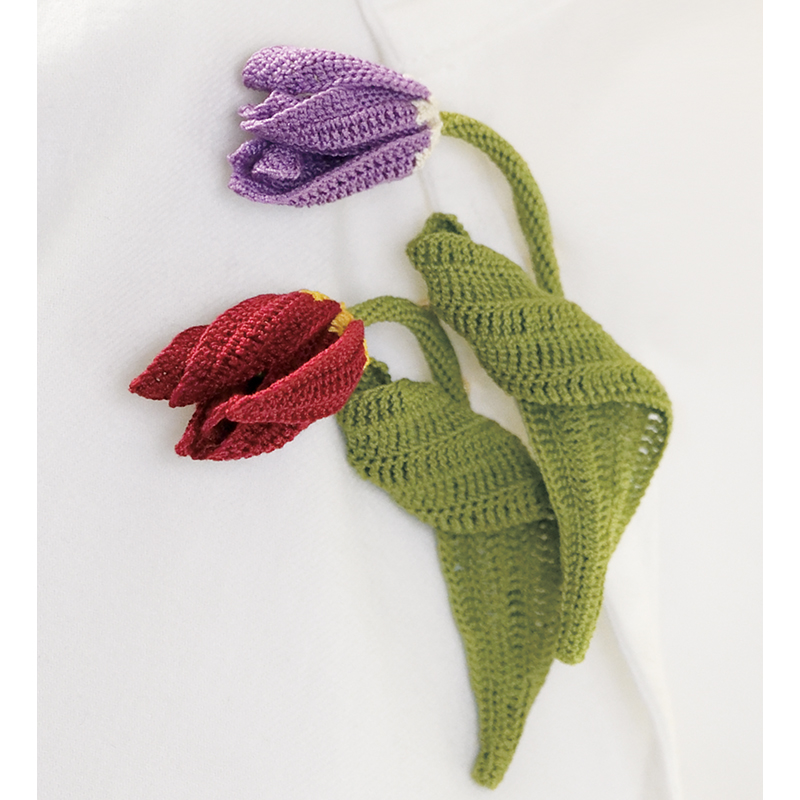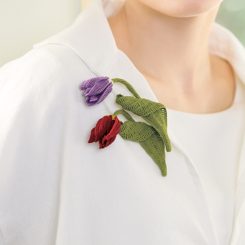 うつむきがちな姿、くるりと巻いた葉が印象的なチューリップの姿をリアルに再現しています。糸で編んだアクセサリーは軽く仕上がるので、いくつか並べてつけるのも素敵。いつものスタイルに愛らしいインパクトを。