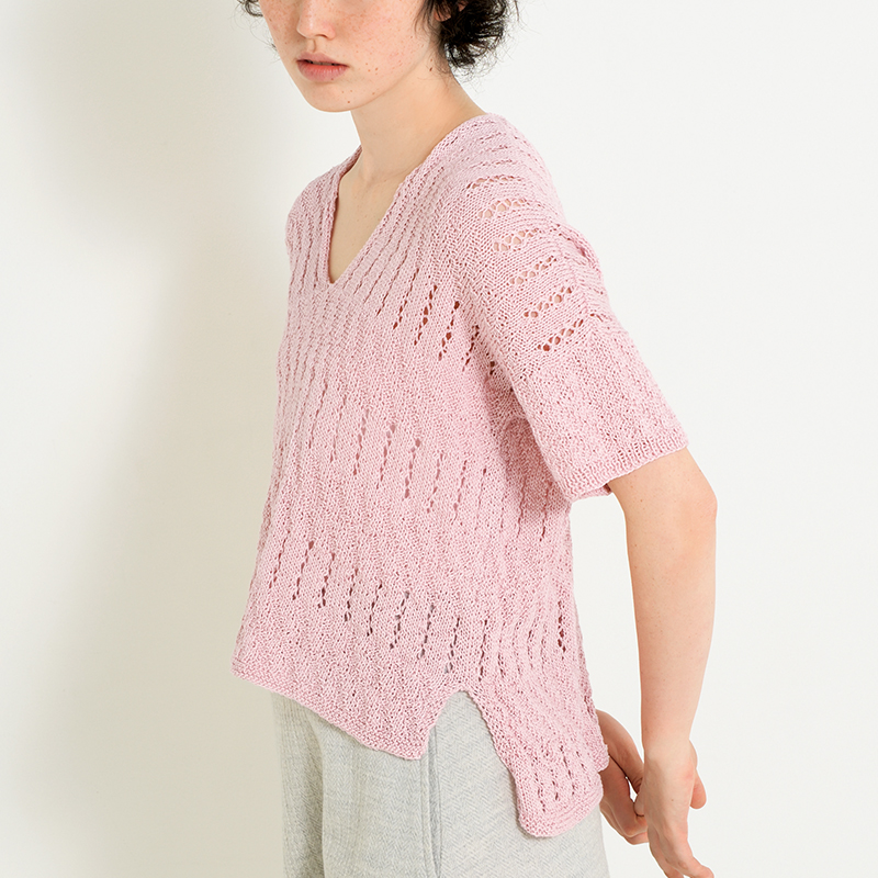 レース模様と裏目が斜めに流れる模様編みの2種類をボーダー状に配置しています。前後身頃で着丈を変えるアレンジも最後の模様を編まずにおくだけ。ロング丈にするのも簡単です。