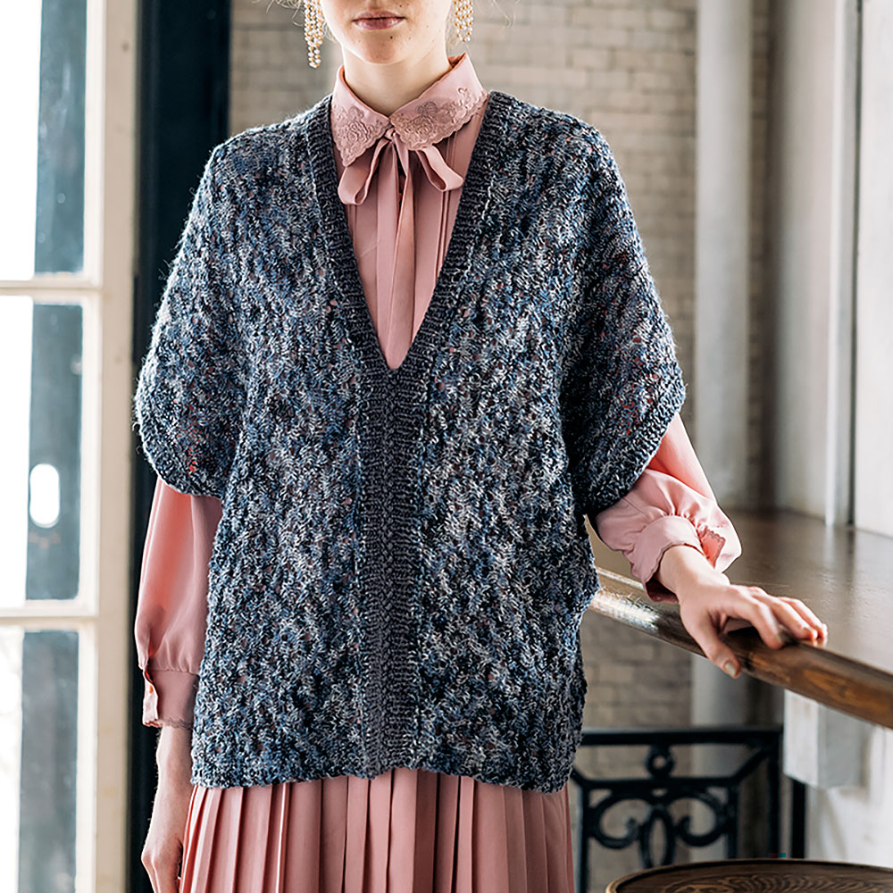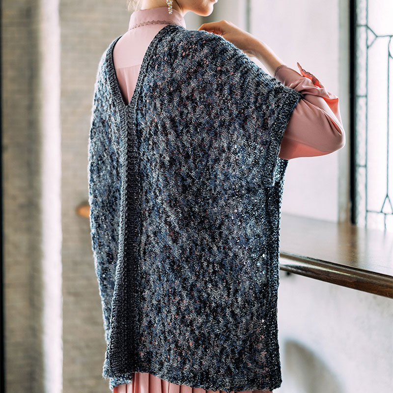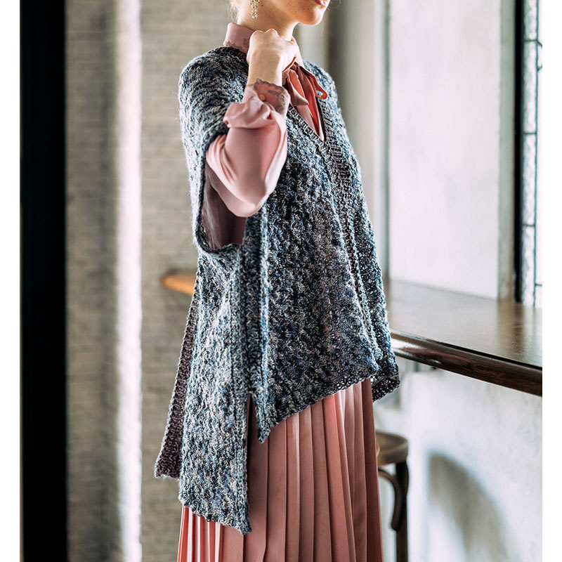 ストール状の2枚の中央をつなげずにあけておくデザインは、まだ着々と進化中。2種類の糸を使用し、中央側はストレートヤーンで編み、肩は増し目をして肩下がりをつけています。太糸で編んでも裃のようにならず、美しいシルエットを保つこだわりです。