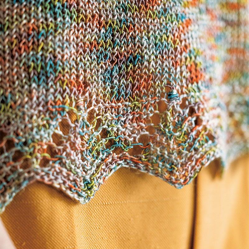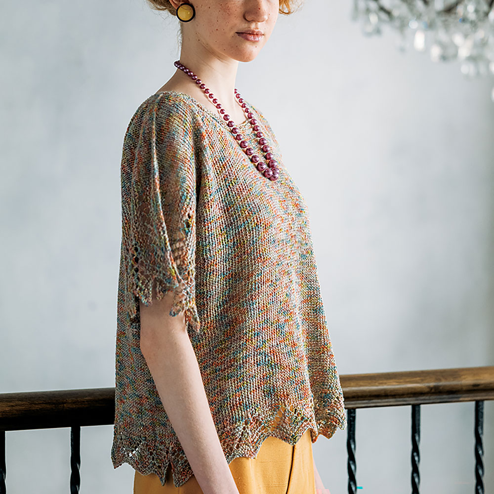 段染めヤーンの魅力が、もっとも輝くメリヤス編み。個性的な素材の面白さも際立ちます。裾と袖口に揺れる大きなリーフ模様は飽きずに編めて、さらに美しいアクセントにも。悪目立ちしないカラーリングで、さらりと着られる半袖プルオーバーです。