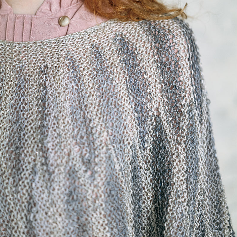 たっぷりとしたバルーンシルエットのプルオーバーは、同系色グラデーションの段染めヤーンを2色使いして。枯山水のような濃淡は風情があり、すべり目の編み込み模様がヨーク状に配されているので、編みごたえ十分です。