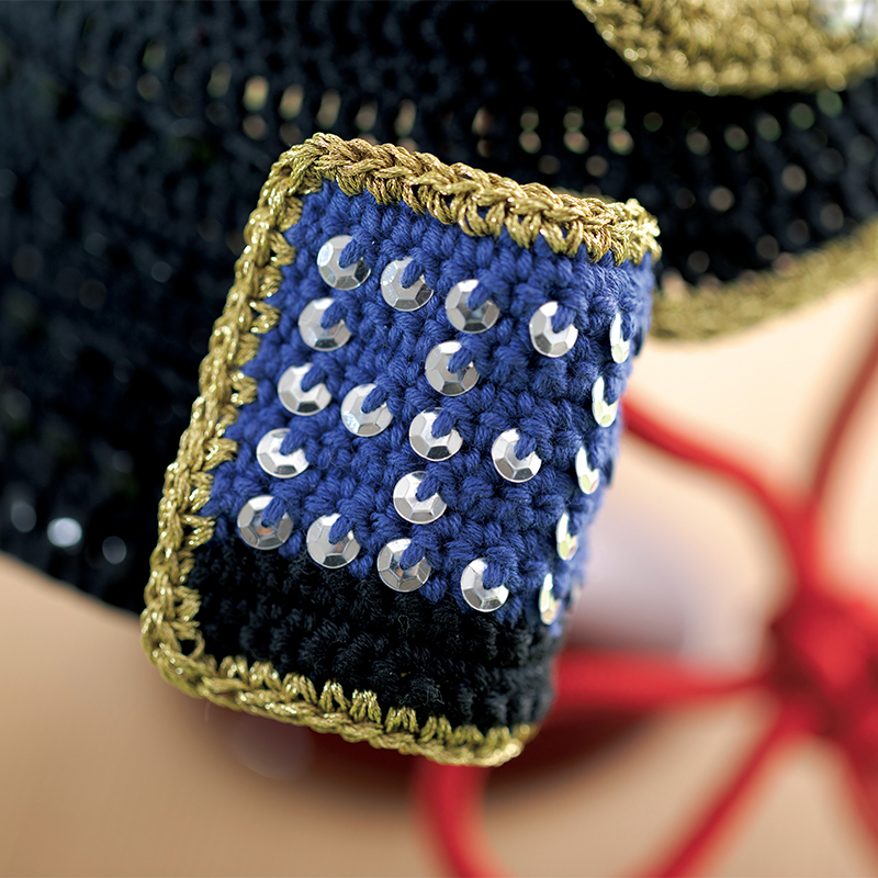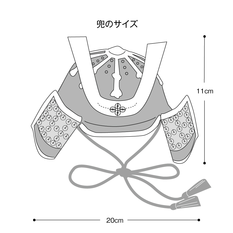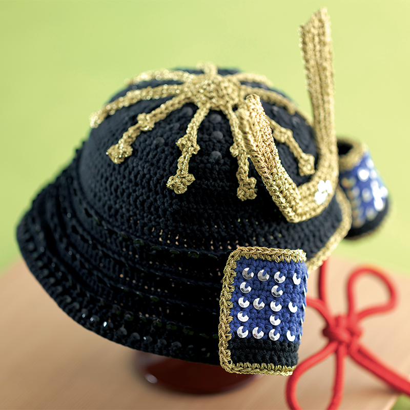 材料:[兜] DMC ナチュラ 黒(11)40g/1玉、青(112)6g/1玉。メタリックパール5 番糸 金(5282)3カセ。スパンコール亀甲5mm 黒1.5g、銀0.6g。5mm のコード 朱色110cm。 [柏餅] DMC ナチュラ 白(2)・深緑(14)各12g/各1玉、カーキ色(989)3g/1玉。手芸綿適宜。