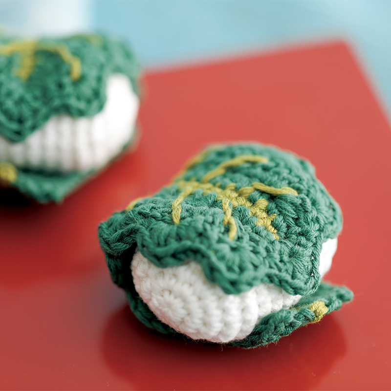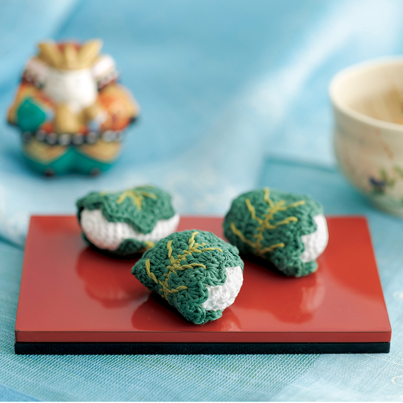 男児の誕生を祝うとともに、健やかな成長と無病息災を願って飾ります。真っ赤なひ もの総角(あげまき)結びも圧巻です。一緒に編みたい柏餅。花より団子は、どんな行事にもかかせない至福のひととき。細編みのつぶが、かぶりりつきたいほどの臨場感ででき上がっております。