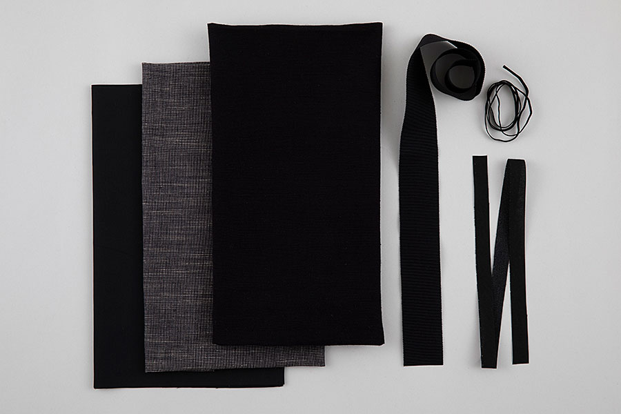 表布(久留米絣)、裏布(ブロード)、接着芯、グログランリボン、ゴム