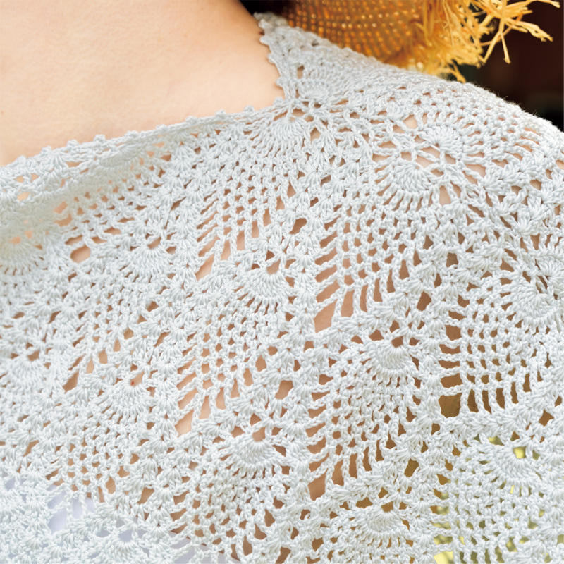 パイナップル模様を綺麗に並べたポンチョタイプのプルオーバーは、まっすぐ編んで一部をはいだだけの簡単仕立て。やさしく編めるので、模様を編む楽しさに専念できます。ショール感覚で肌寒いときにさっと羽織るのもおすすめ。