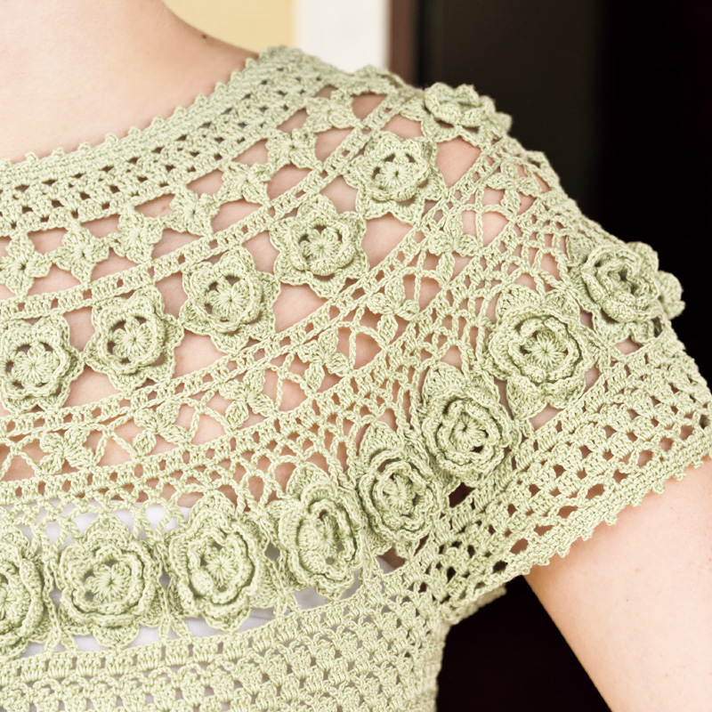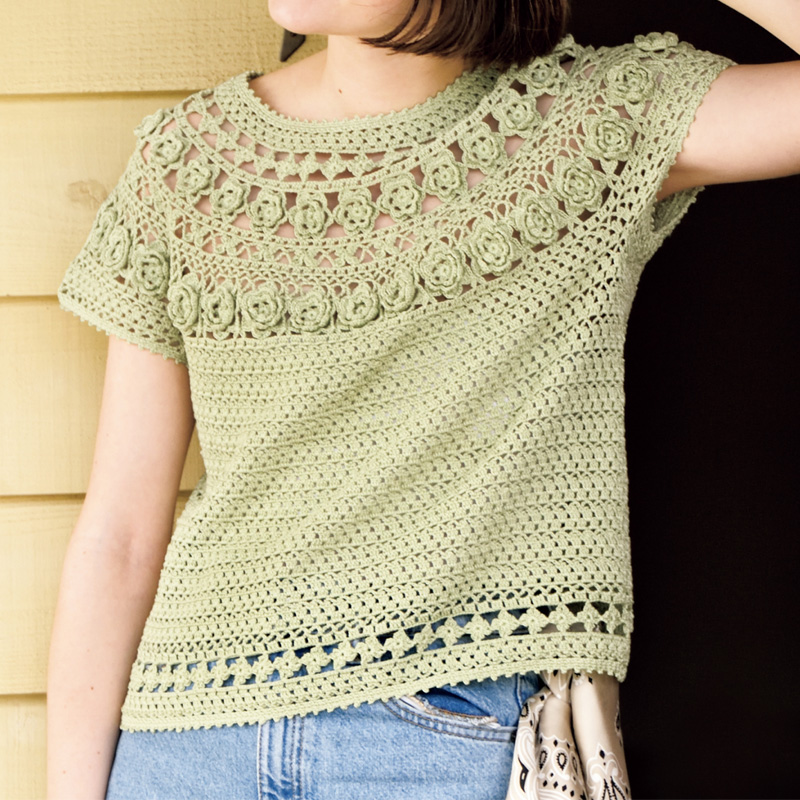 アイリッシュクロッシェのバラのような立体的なモチーフを丸ヨークに配した、愛らしいプルオーバー。爽やかなグリーンでほのかに甘さを抑えて。