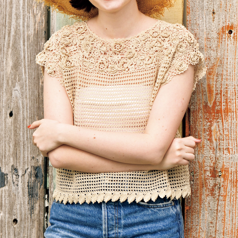 繊細なアイリッシュモチーフをふんだんにあしらったヨークを、胸元で切り替えました。憧れのアイリッシュクロッシェはちょっとハードルも高いけれど、頑張ってチャレンジしてみたい。