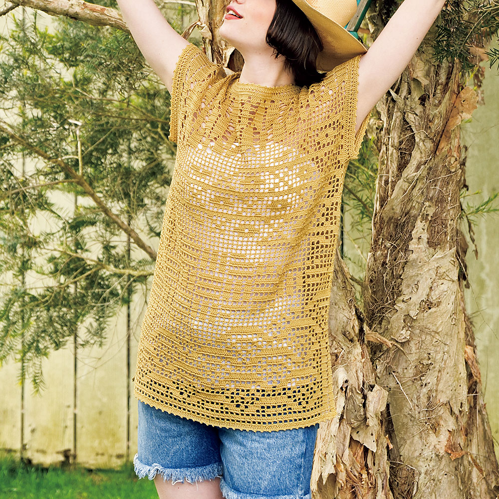 斜めのジグザグに模様を編み出した方眼編みは、矢羽根に市松、青海波など、和を意識した柄を大胆に表現して。大きな四角いクロスを2枚はいだようなシンプルな仕立てですが、着ると体に沿うフレンチスリーブのプルオーバーになります。