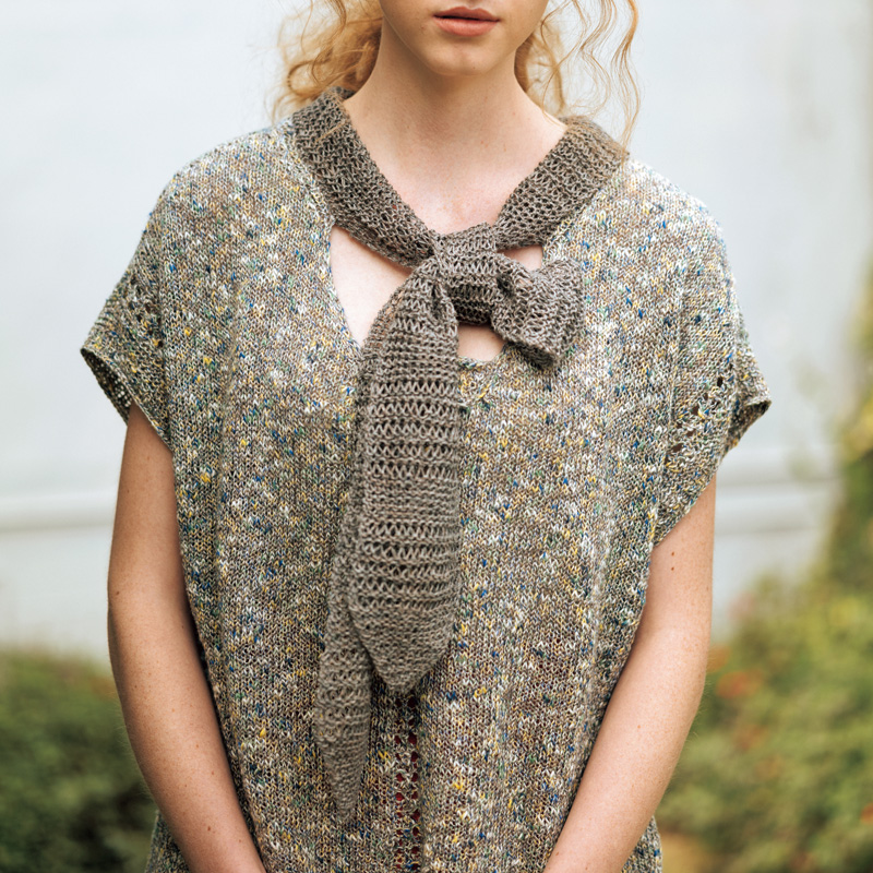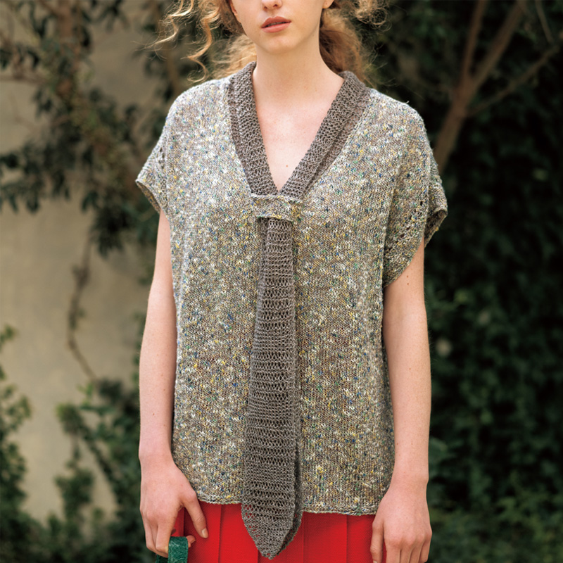 せっかく時間をかけて編むのだから、着回しがきくデザインにチャレンジ! かすり染めの身頃に単色のタイがついたプルオーバーは、タイの結び方だけでなく、前後の衿の形の違いもあって幾通りもの表情が楽しめます。お出かけ前、鏡の前での悩みすぎにご注意を。