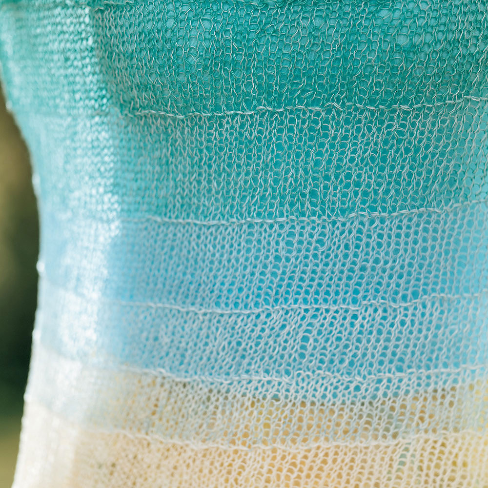 材料:ておりや ハードリネンA青緑(15)65g、生なり(42)45g、水色(11)40g。