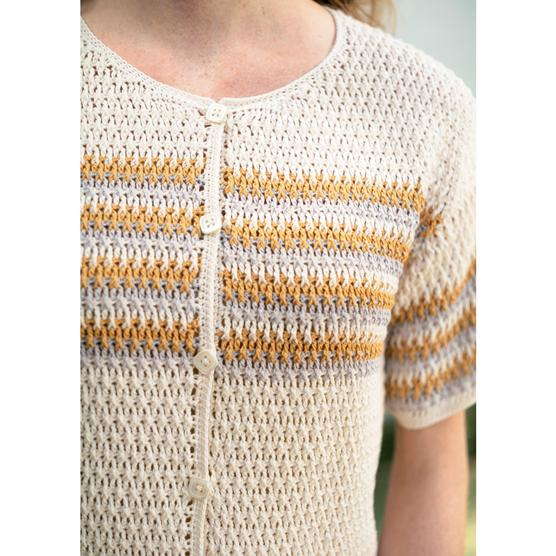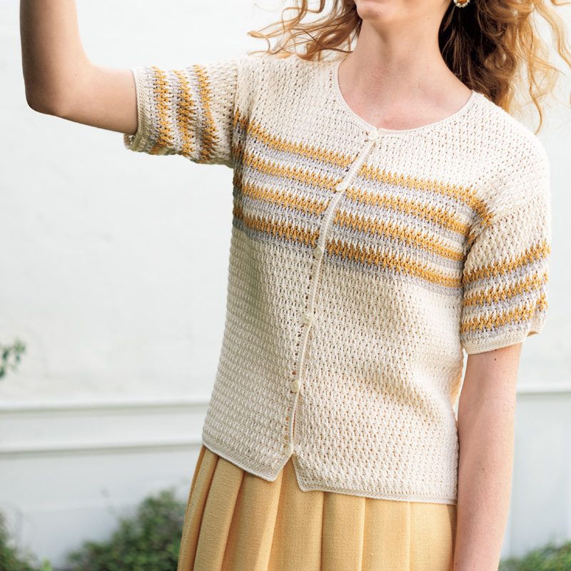 材料:毛糸ピエロ♪ ビューティーシルクコットン UV ホワイト(01)205g/7 玉、シルバーグレー(14)・サフランイエロー(22) 各30g/各1玉。直径15mmのボタン6 個。