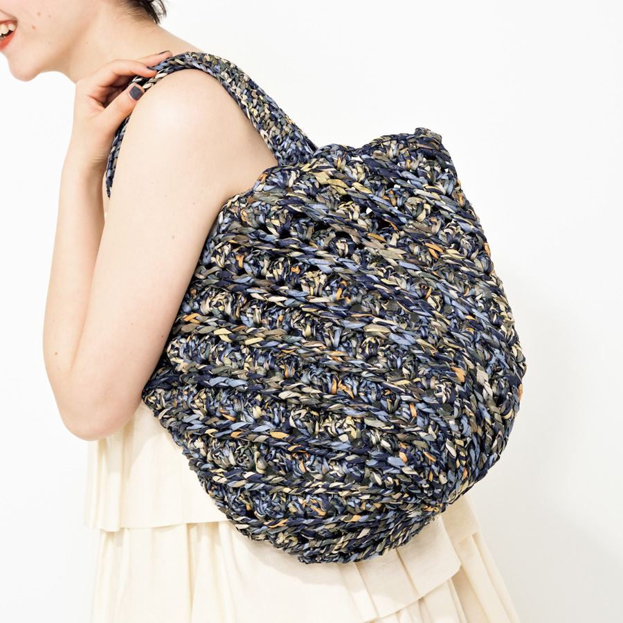和紙風の素材感が、ぼかしのグラデーションとタッグを組んだ印象的な糸を、さらに3本どりにして編んだマルシェバッグ。力強く流れるラインが、涼しげな印象を作ります。軽さと強度もばっちりの頼もしさ。
