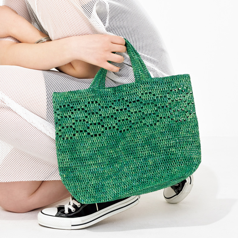 森林浴気分で深呼吸したくなる緑の濃淡と、爽やかに透ける方眼のレース模様が夏らしいデザイン。A4サイズの書類がすっぽり入る、普段使いしやすい大きさです。底部分は、細編みで編んだ長方形タイプ。