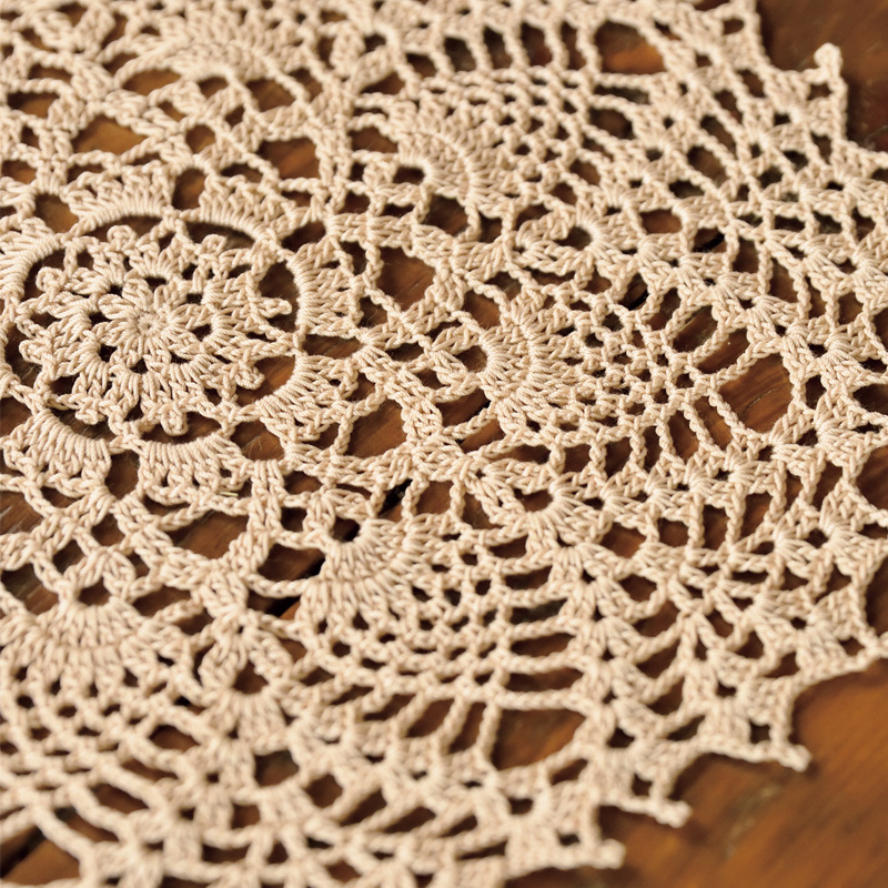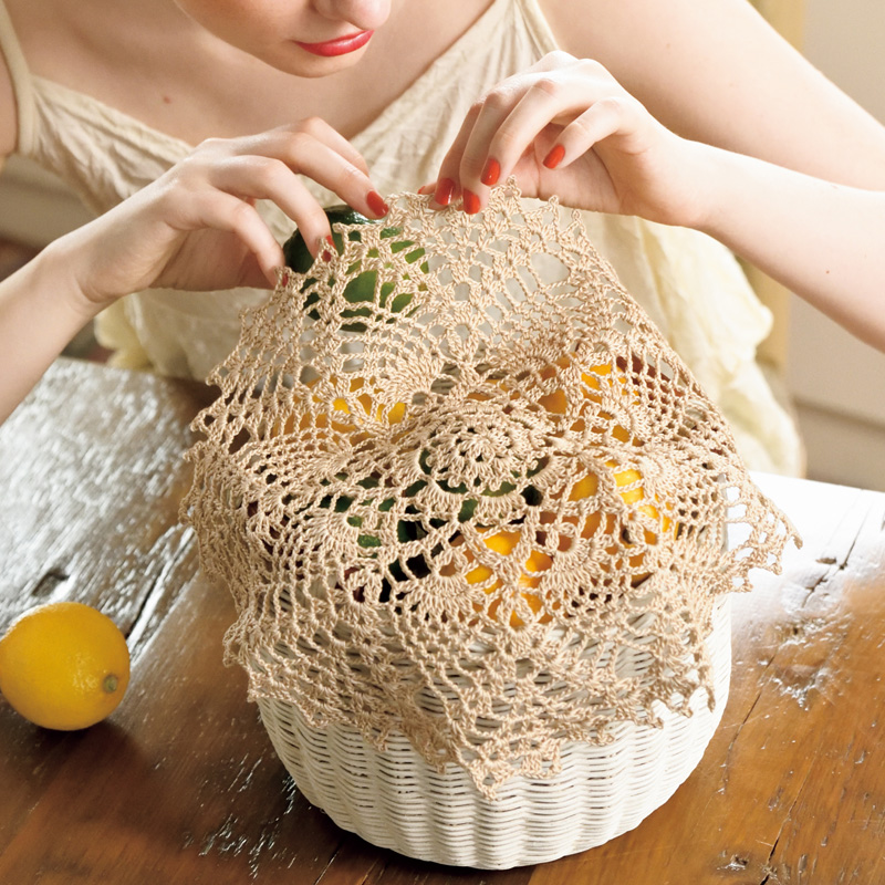 華やかなパイナップル模様が美しい、正統派のドイリーです。大きめのドイリーは敷物としてはもちろん、かごカバーやジャグカバーなど、ちょっとしたカバークロスとしても使えます。