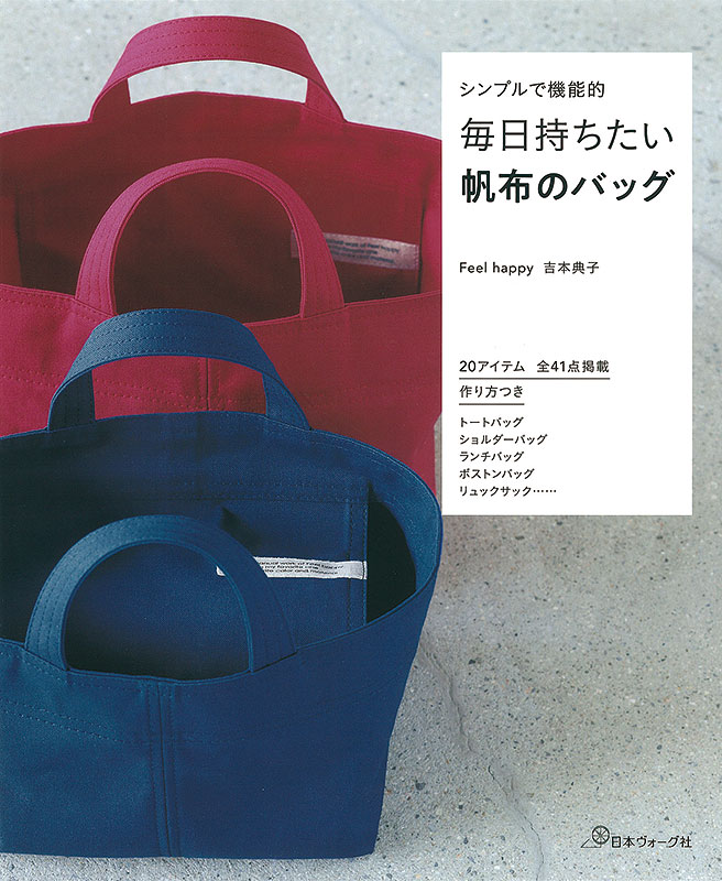丈夫で実用的な帆布のバッグは流行に左右されず長く使えるアイテム。他にない気の利いたデザインと機能性が魅力のFeel happy 吉本典子さんの帆布のバッグをご紹介します。定番トートにふたをつけた「PELON BAG」、横長の形がかわいい「FEEL HAPPY TOTE」、丸底が愛らしい「ウフトート」など毎日の相棒にぴったりのシンプルでシルエットがきれいなバッグを始め、ワンハンドルショルダー、、ランチバッグ、畳むと8角形になる「ハチアズマ」など16型を紹介、色違い、サイズ違いを合わせて41点掲載。地元、香川高松の素敵なアトリエ取材も入れながら、1冊まるごとFeel happyの世界を楽しめます。
