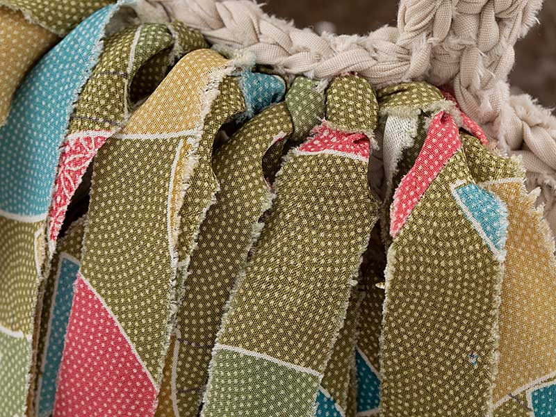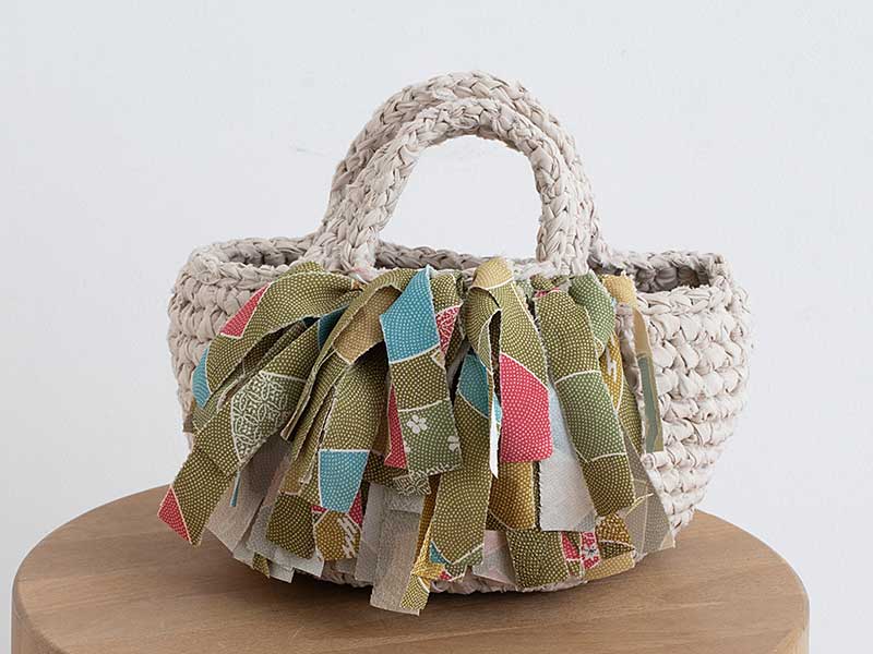 【キット作り方つき】日本中で使われなくなった着物を細いテープ状にした、「kimono yarn(キモノヤーン)」をアクセントにした可愛いミニバッグ。バッグ本体は自分で布を裂いてテープ状にしたものを作り、その裂き布を編んで作るので布の質感が楽しめます。本体ができたらキモノヤーンを編み目に取り付けていきます。反対側は飾りなし。