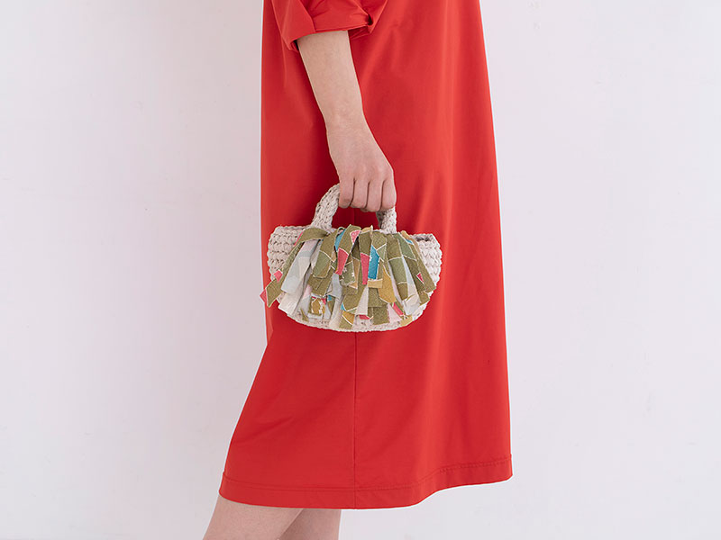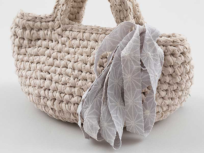 【キット作り方つき】日本中で使われなくなった着物を細いテープ状にした、「kimono yarn(キモノヤーン)」をアクセントにした可愛いミニバッグ。バッグ本体は自分で布を裂いてテープ状にしたものを作り、その裂き布を編んで作るので布の質感が楽しめます。本体ができたらキモノヤーンを編み目に取り付けていきます。反対側は飾りなし。