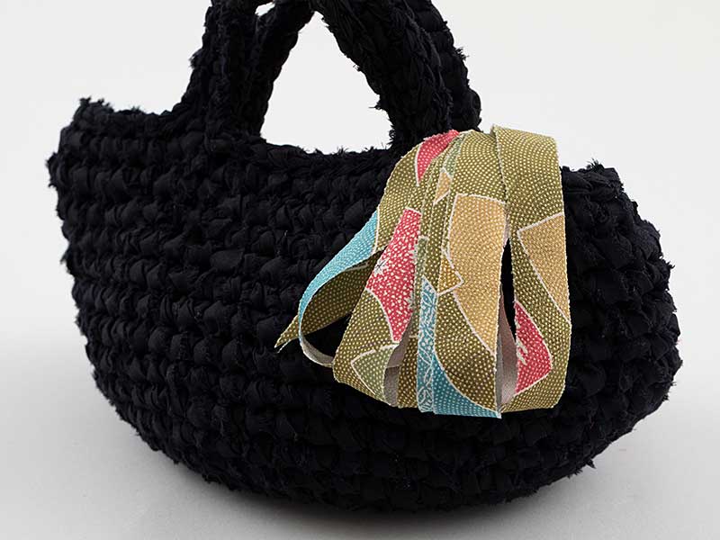 【キット作り方つき】日本中で使われなくなった着物を細いテープ状にした、「kimono yarn(キモノヤーン)」をアクセントにした可愛いミニバッグ。バッグ本体は自分で布を裂いてテープ状にしたものを作り、その裂き布を編んで作るので布の質感が楽しめます。本体ができたらキモノヤーンを編み目に取り付けていきます。反対側は飾りなし。